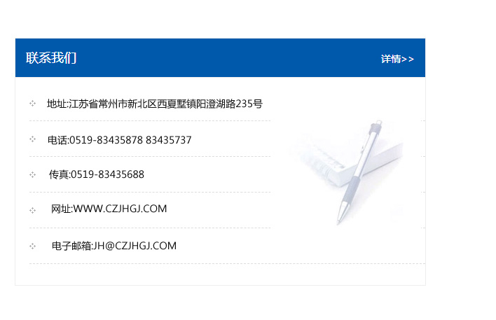 地址:常州市新北區友邦商務大廈1幢16、17層  電話:0519-85101652  傳真:0519-85112595  郵編:213022  網址:www.cz-jiayue_cn.jsxqylgl.com  郵箱:xiajifengaa@163.com